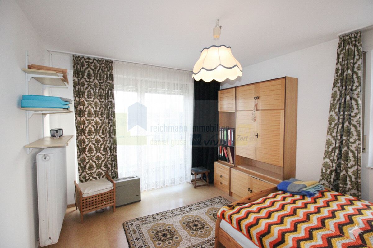 Im Obergeschoss erwarten Sie drei Schlafzimmer sowie ein Tageslichtbad, das mit einer Dusch-Badewanne, WC und Handwaschbecken ausgestattet ist. Der Balkon, der dieses Stockwerk ergänzt, lädt zum Verweilen und Entspannen ein und bietet Ihnen einen weiteren schönen Blick auf die Umgebung.