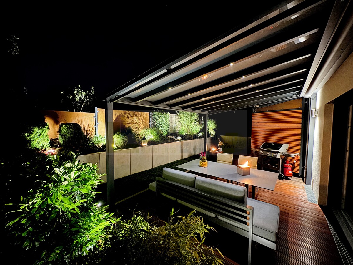 * Private Südwest-Terrasse mit moderner Überdachung, integrierter Beleuchtung und elektrisch ausfahrbarer Markise